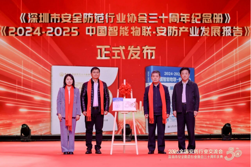 为致敬深安协三十年奋斗征程,活动现场举行了《深圳市安全防范行业协会三十周年宣传片》首映仪式。该片以震撼的视觉语言,浓缩呈现了协会三十年来在党建引领、专业活动、国内外交流、公益践行等方面的壮阔画卷与卓越成就,引发了现场来宾的深切共鸣。与此同时,活动现场还正式发布了两份承载行业智慧与记忆的重要文献:《深圳市安全防范行业协会三十周年纪念册》与《2024-2025中国智能物联-安防产业发展报告》。